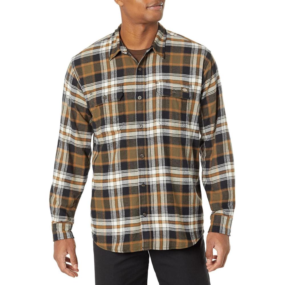 Dickies Mens L/S Flex Flannel Shirt(Black/Dark Olive/Anque White Multi Windowpane)